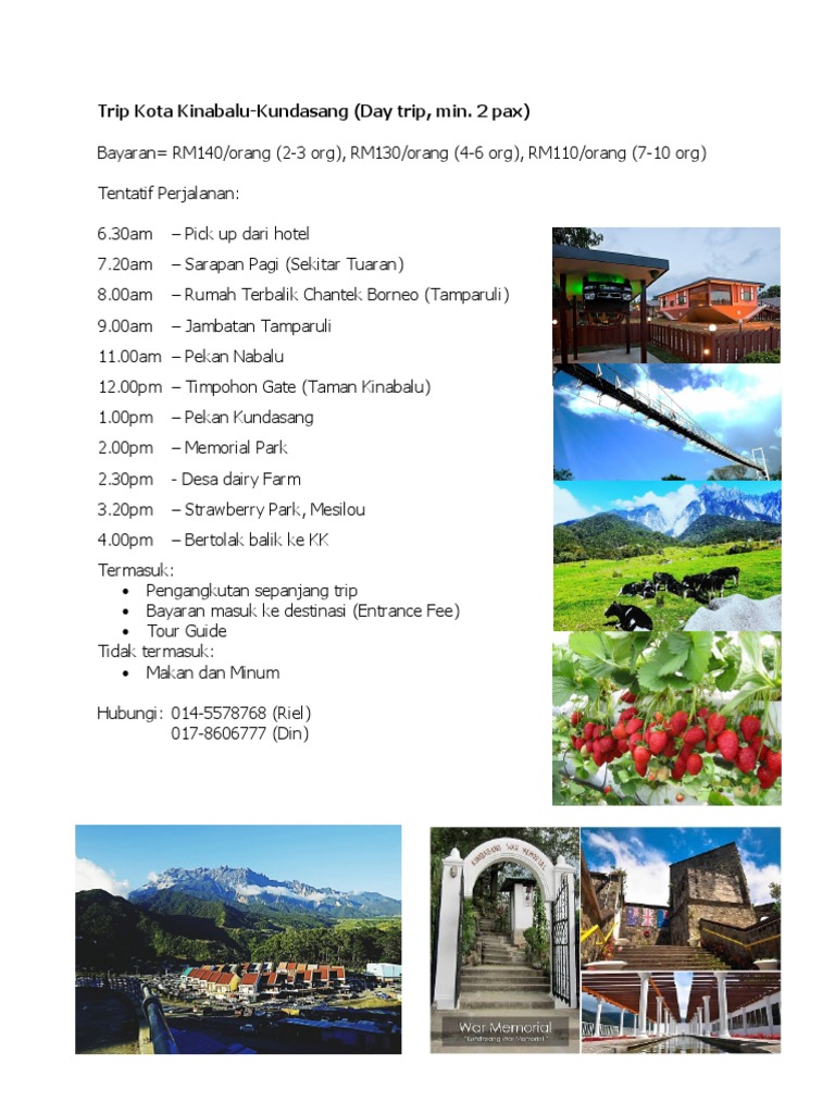 Kota kinabalu ke kundasang. Sila lihat butiran butiran lanjut di bawah dan jika ada sebarang soalan jangan segan untuk menghubungi kami. Pemandu akan cadangkan tempat makan dan akan bawa ke restaurant. Pintu masuk pendaki pendaki. Perjalanan menuju ke kundasang dari kota kinabalu lebih kurang jaraknya sejauh 95 km dan mengambil masa 2 jam perjalanan.